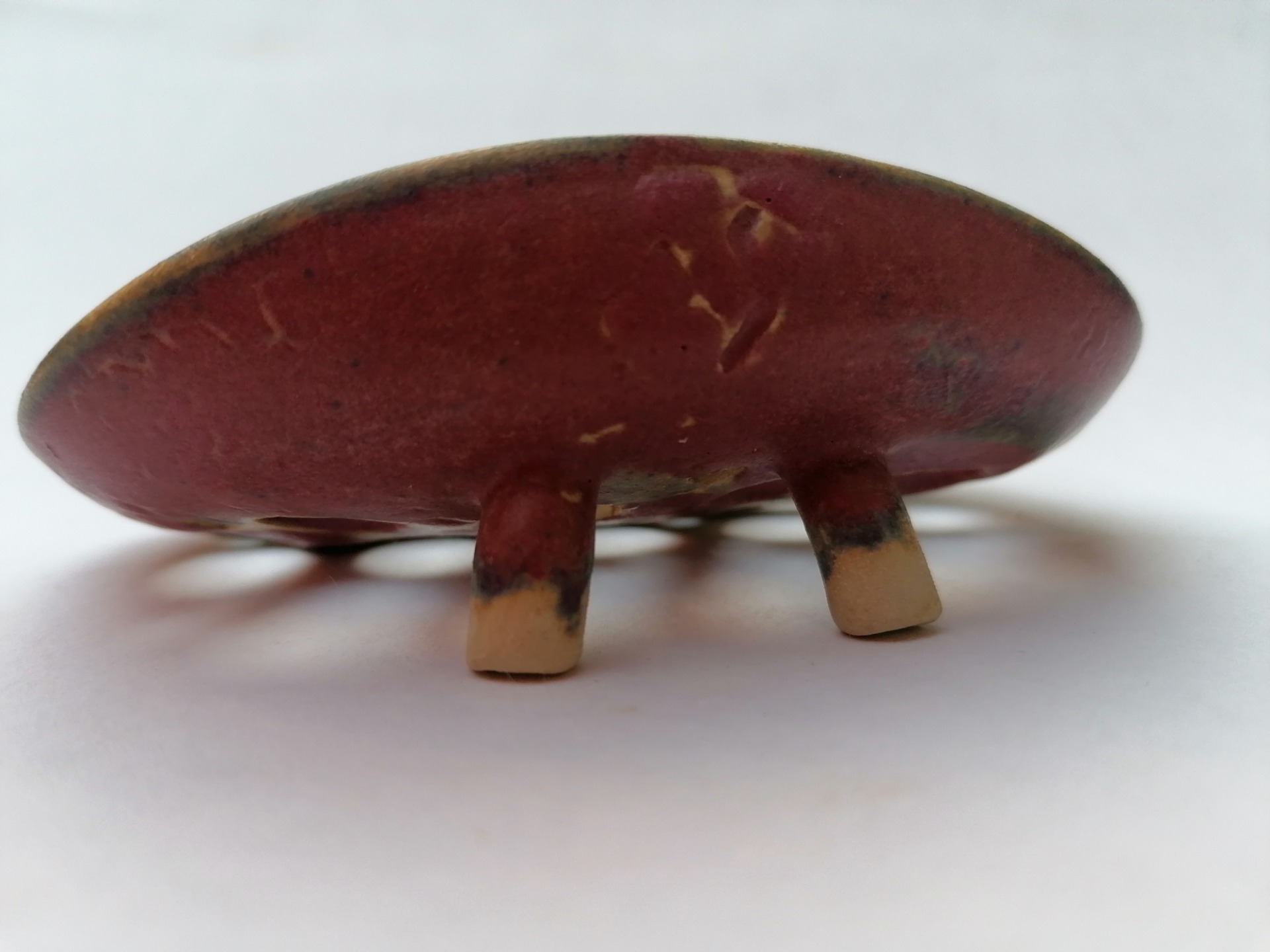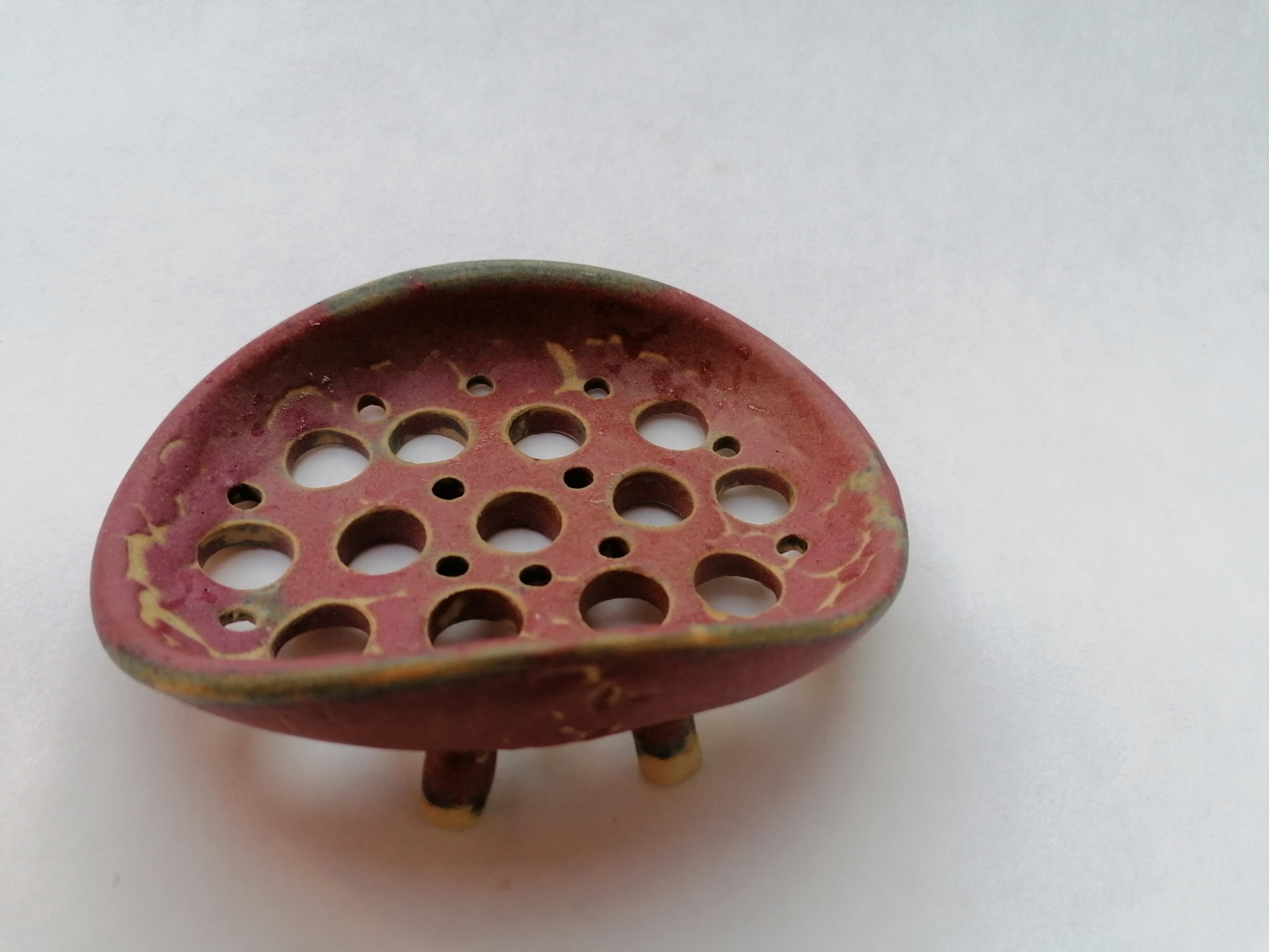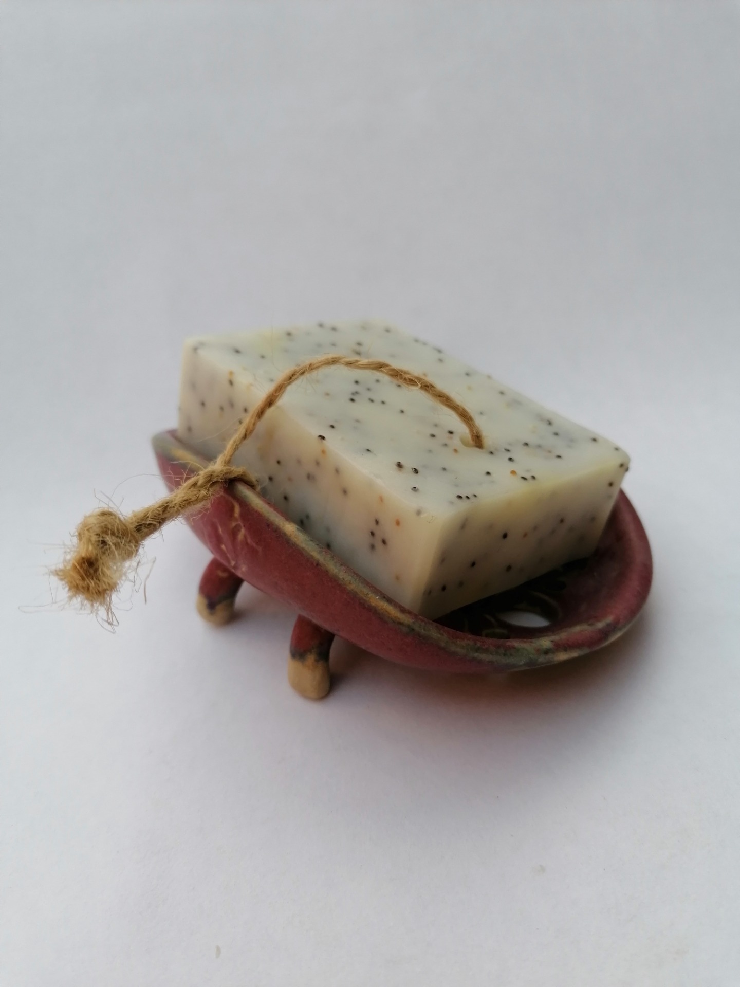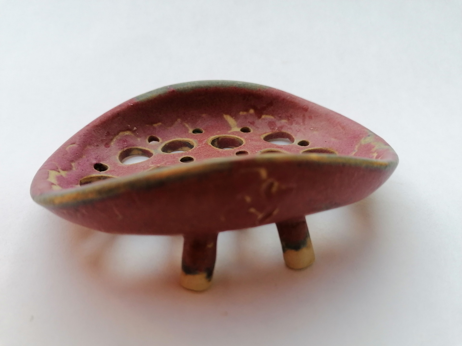 Ručne točená mydelnička na hrnčiarskom kruhu, dvakrát vypálená. Teplota druhého výpalu 1250 °C.